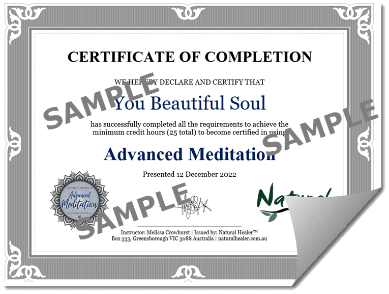 A lovely Advanced Meditation Certification of Completion (PDF) upon completion to print out if you choose to display to show others your learning achievement!